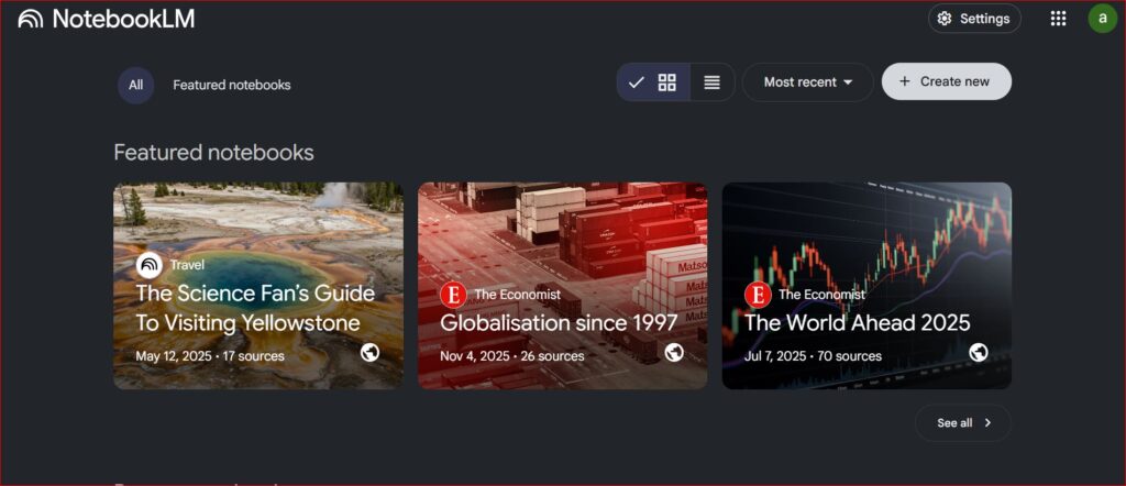 • الوصول إلى NotebookLM: قم بزيارة الموقع الرسمي لـ NotebookLM وتأكد من تسجيل الدخول باستخدام حساب Google الخاص بك.