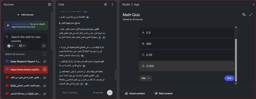 • الخطوة 3: تحليل الأداء: راجع إجاباتك وقارنها بالإجابات التي يقدمها NotebookLM. هذا يساعدك على تحديد نقاط قوتك وضعفك.