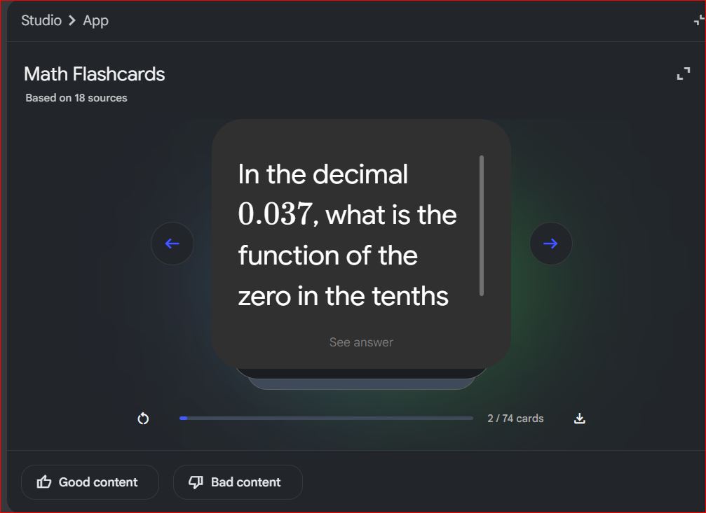 لتعزيز الحفظ والمراجعة السريعة، يمكن لـ NotebookLM بطاقات فلاش (Flashcards) تلقائيًا من مصادرك. يمكنك أن تطلب منه تحويل النقاط الرئيسية إلى بطاقات فلاش، كل منها يحمل معلومة موجزة، مما يجعل المراجعة اليومية سريعة وممتعة.