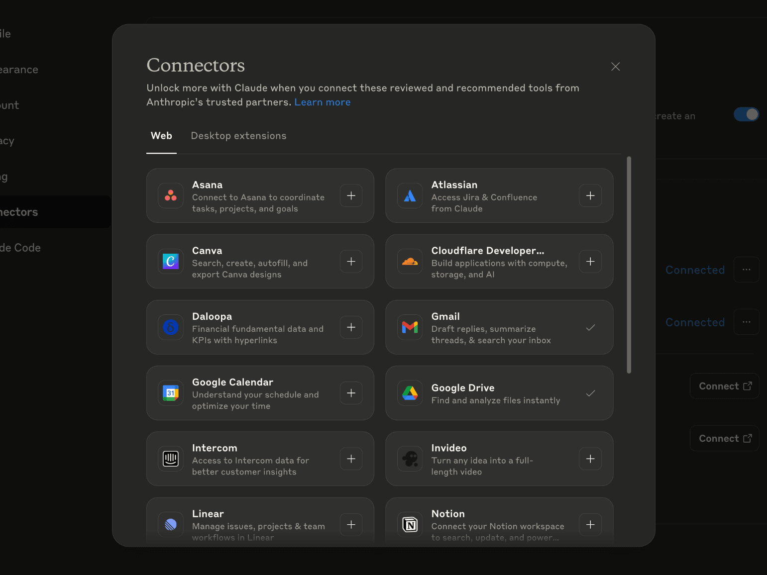 تحديث ضخم آخر هو دعم الموصلات (Connectors) المبنية على بروتوكول Anthropic MCP.