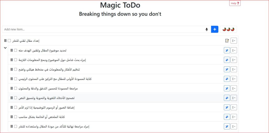 الميزة الأشهر في Goblin Tools هي أداة Magic To Do، وهي المسؤولة عن تحويل أي مهمة عامة أو غامضة إلى قائمة خطوات صغيرة ومنطقية.