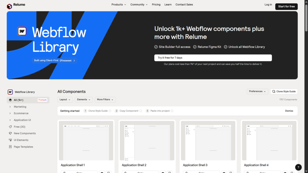 - مكتبة مكونات شاملة: توفر Relume مجموعة واسعة من الأقسام الجاهزة التي يمكن نسخها ولصقها مباشرة في مشروع Webflow الخاص بك، مما يقلل وقت التطوير بنسبة تصل إلى 80%.