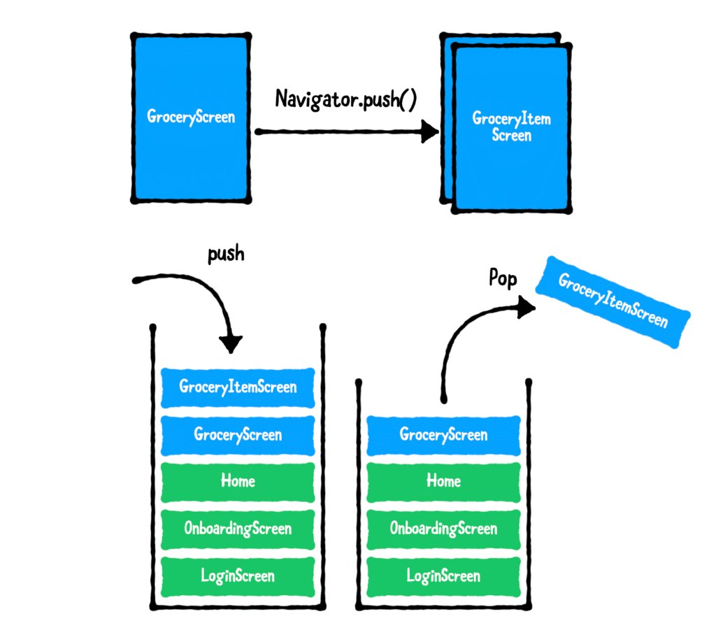 يعتمد النهج التقليدي للتنقل في Flutter، المعروف بـ Navigator 1.0، على مفهوم بسيط ولكنه فعال في التطبيقات الصغيرة: مكدس الصفحات (The Stack). يمكن للمطور أن يتخيل Navigator كحاوية تدير مجموعة من الشاشات (التي يطلق عليها في Flutter اسم Routes). تعمل هذه الحاوية تمامًا مثل مكدس الأوراق، حيث تكون الشاشة الحالية التي يراها المستخدم دائمًا هي الموجودة في قمة المكدس.